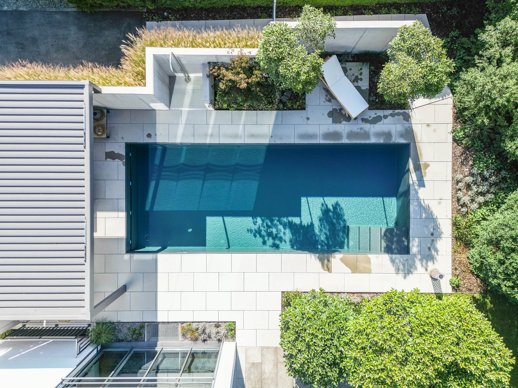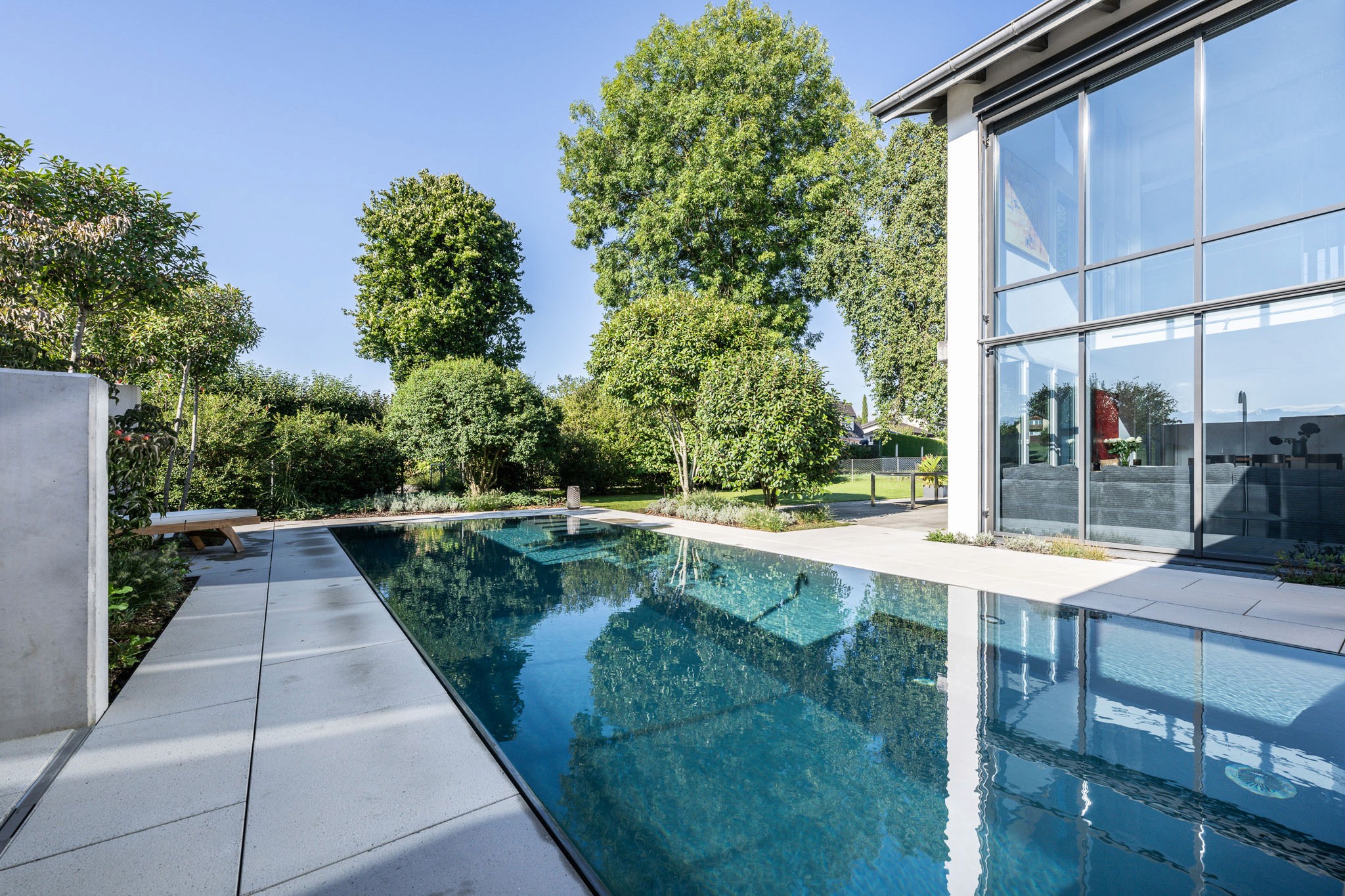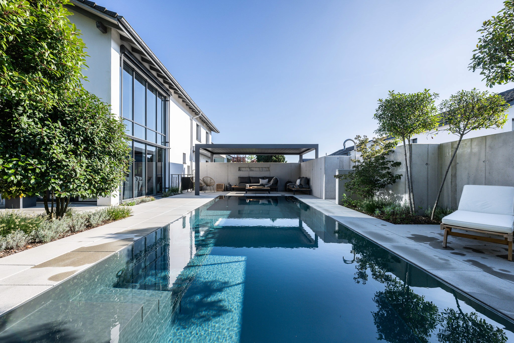 Ein neuer Pool bildet das Herzstück der Umgestaltung und strukturiert die Terrasse. Sichtbetonmauern erweitern den Raum optisch und schaffen einen grosszügigen Bereich mit Privatsphäre, der als erweiterter Wohnraum dient. Eine Pergola beschattet gezielt einen Sitzplatz und verleiht diesem Bereich hohe Aufenthaltsqualität.